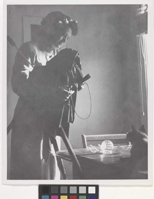 Photographer Carlotta Corpron had a brief but important career as an artist and a decades-long impact as a professor at Texas State College for Women (now Texas Woman’s University). In the 1930s and ‘40s she experimented with light, influenced by the ideals of the Bauhaus and the Institute of Design as brought to Denton, Texas, by László Moholy-Nagy and György Kepes. Her early photographs investigated how light transforms natural objects, but in later projects she took light itself as her subject, capturing its reflection and refraction in abstract compositions that sometimes involved cropping or combining multiple negatives. Corpron bequeathed her archive to the Museum, which holds 138 prints, over 800 negatives, and the Carlotta Corpron Papers.