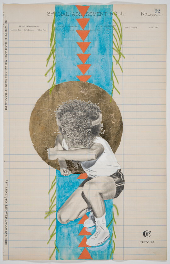 Graphite, ink, watercolor, gold leaf, and embroidery floss on antique ledger paper 2023.31