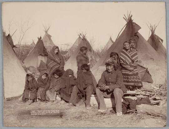 [Group of Native Americans with soldiers and tipis], ca. 1890