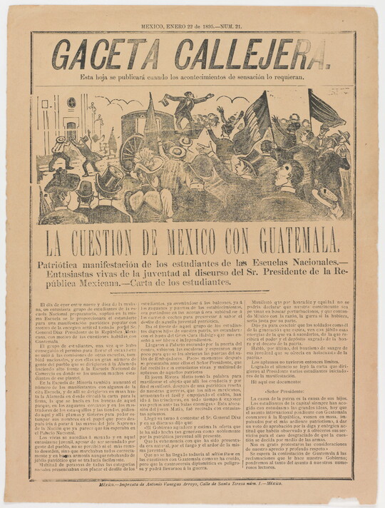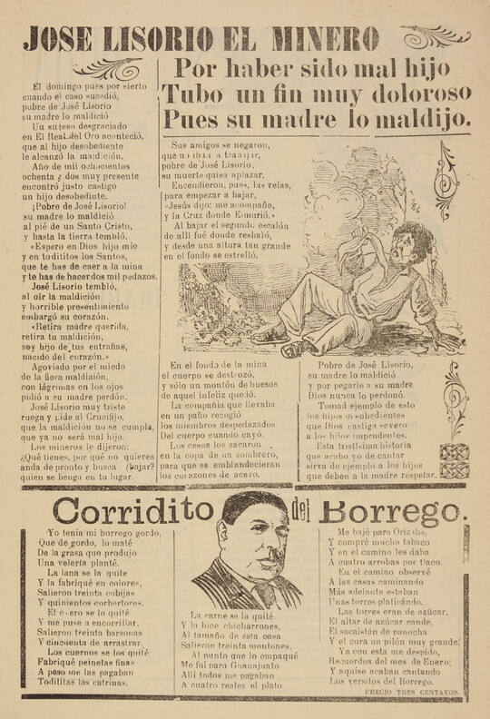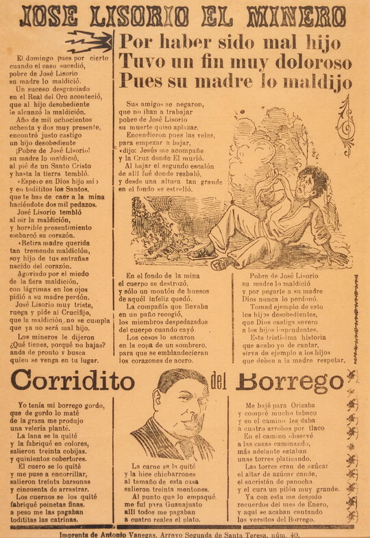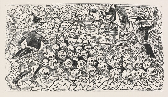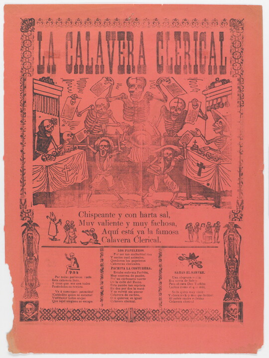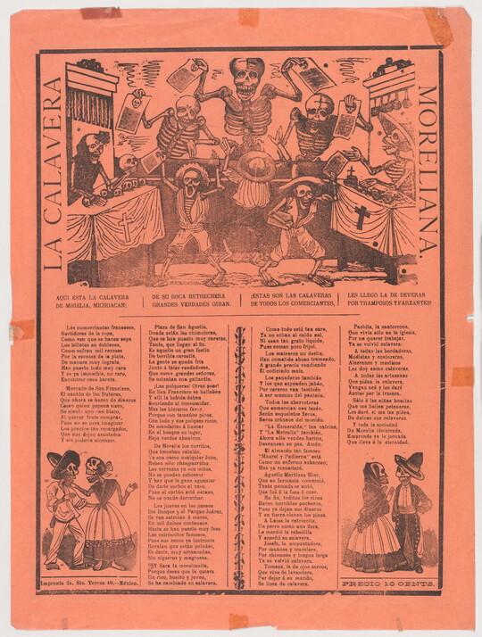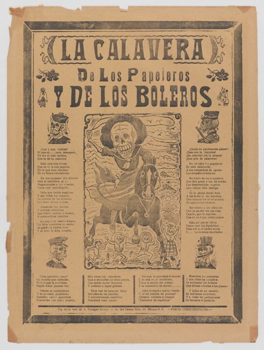 José Guadalupe Posada was a Mexican illustrator known for his satirical calaveras—illustrations featuring skeletons and skulls. Published throughout Mexico during the late 19th and early 20th centuries, Posada’s woodcuts and wood engravings appeared in inexpensive literature, most notably politically charged broadsides dealing with pressing political issues of the day. Following Posada’s death, his calaveras came to be associated with the celebrations of Día de Los Muertos (Day of the Dead). More than 400 of Posada’s works are in the Carter’s collection, including newspaper illustrations, broadsides, and a selection of his original printing blocks.