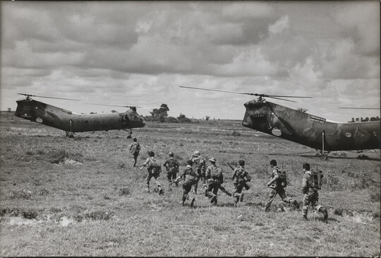 U.S. transport helicopters wait to pick up Vietnamese troops, for a mission targeting the Viet Cong near the Cambodian border, 1964