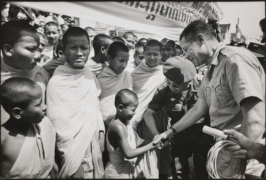 U.S. Defense Secretary Robert McNamara, with Premier of Vietnam, General Nguyen Khanh, greeting Buddhists as part of a morale-building trip to villages in the Delta area of Vietnam, 1964