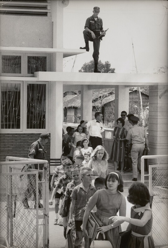 U.S. Soldiers in Vietnam guard an American school in Saigon after Viet Cong terrorist bombings, 1964