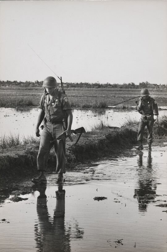 A U.S. Lieutenant serving as an Army “Advisor” leads a mission into a small village 25 miles southwest of Saigon, reported to be the site of a Viet Cong ammunition factory, 1964
