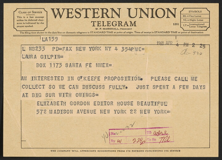 • Correspondence: both personal and business to and from contemporaries such as Ansel Adams, Ira W. Martin, Georgia O’Keeffe, and Clarence H. White