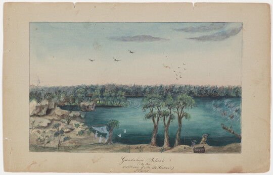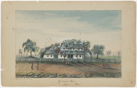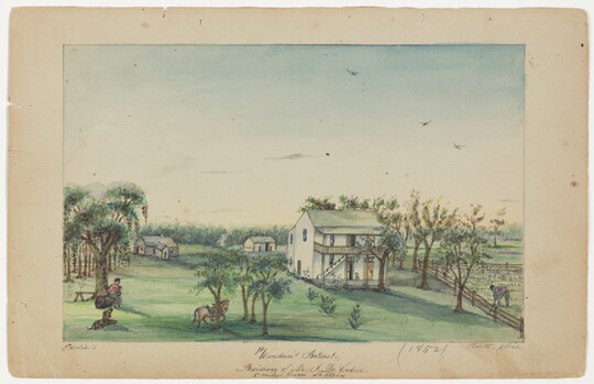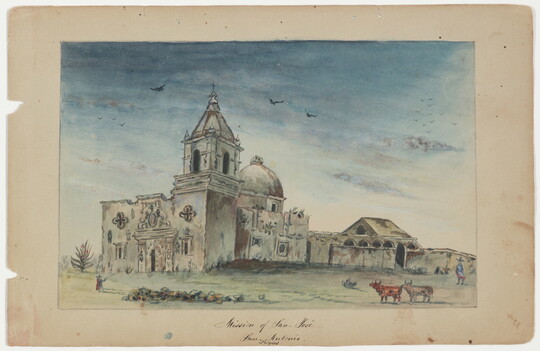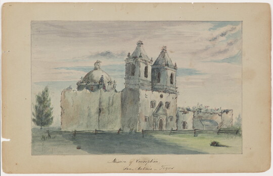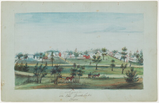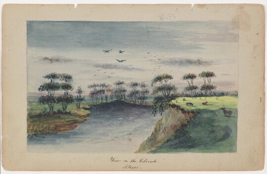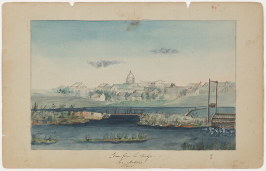 Throughout her travels, Sarah documented her life in Texas with written accounts in her journal and jewellike watercolors. Nineteen of her paintings are part of the Museum’s watercolor collection, along with one of her journals, a land map, and art supplies. Depicting landscapes and town views, her pictures showcase Hardinge’s achievements as an artist, and they offer an invaluable record of settler-colonial life in Central Texas.