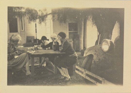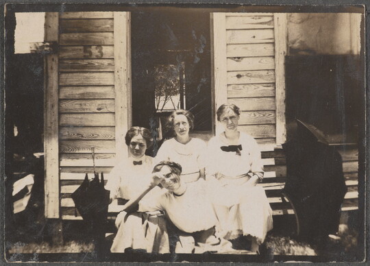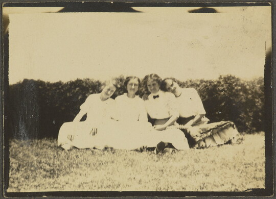 [Four women sitting in grass, posing for camera], ca. 1910-1920