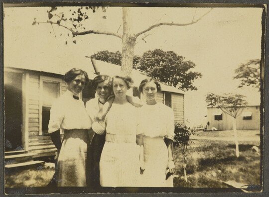 [Four women posing for camera on riverbank], ca. 1910-1920