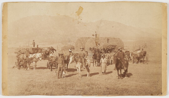 [Group of people with bales of hay and horses], 1880s