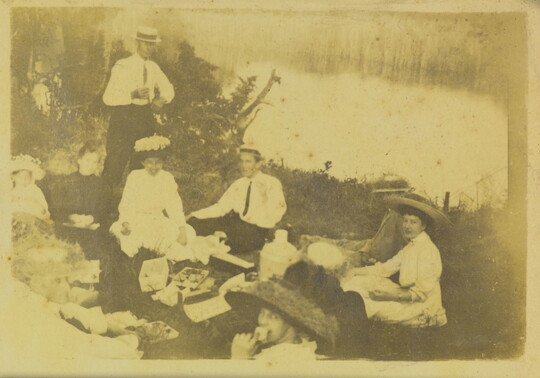 [Group picnicking near river], ca. 1910-1920
