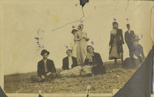 [Group of young men and women on hillside], ca. 1910-1920