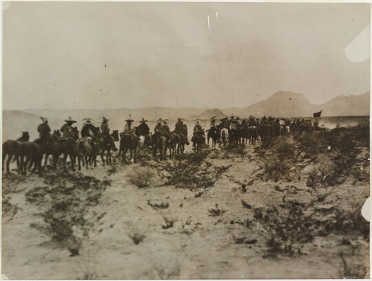 [Group of Mexicans on horseback, crossing desert], ca. 1914