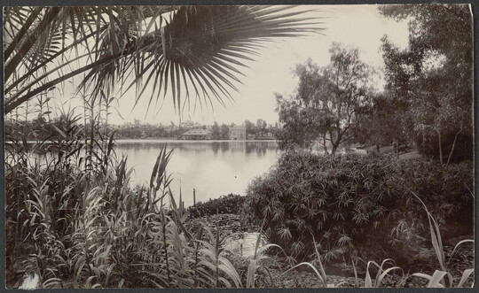 [Large homes from across a lake, surrounded with lush vegetation], ca. 1900-1910
