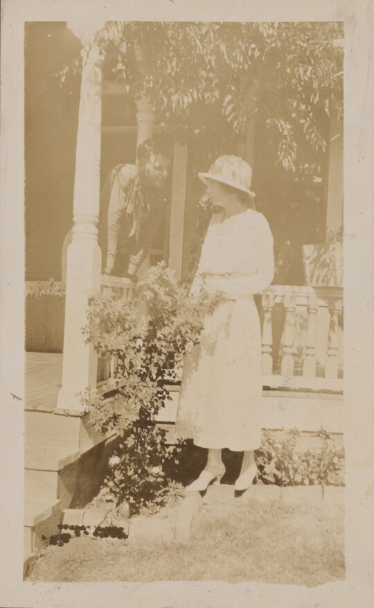 [Man and woman conversing over porch railing], ca. 1910-1920