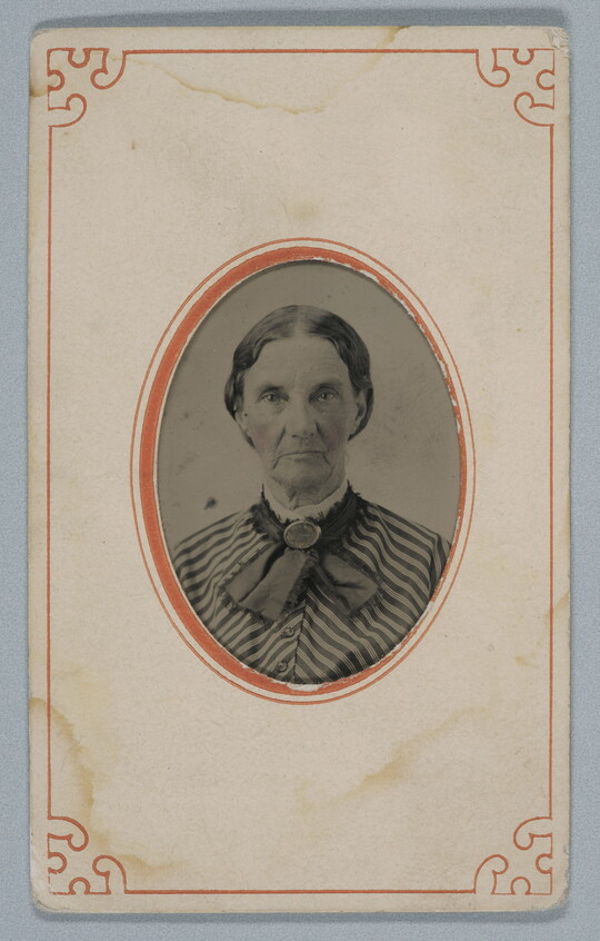 [Older woman in striped dress, bust view], ca. 1863-1875