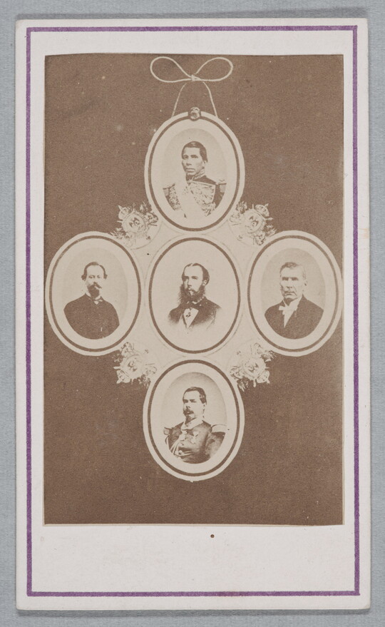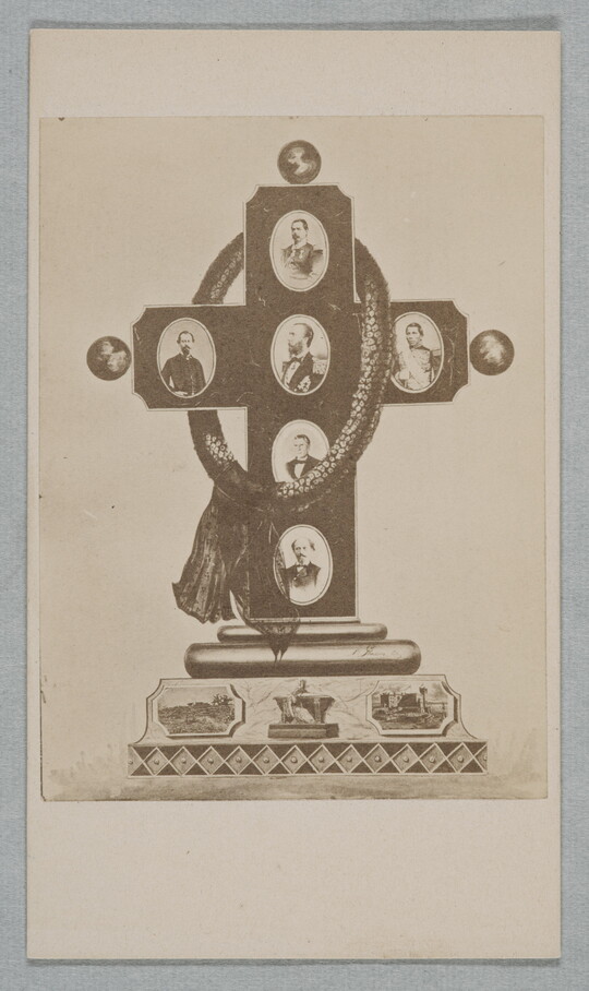 [Portraits of Maximilian and others on a cross draped with wreath], ca. 1867