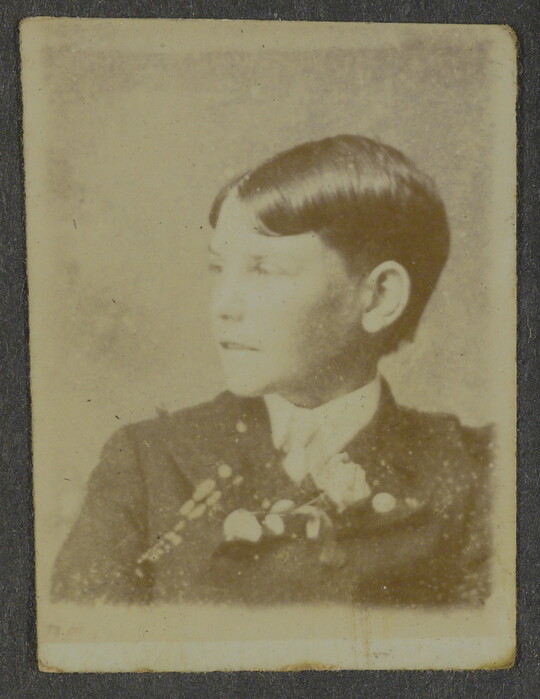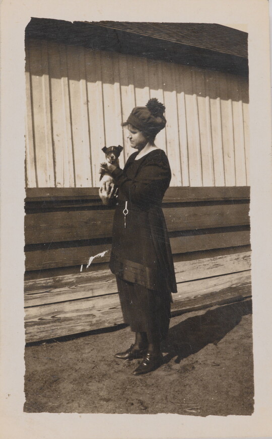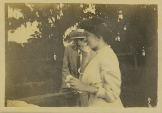 [Profile of woman with man standing behind her], ca. 1910-1920