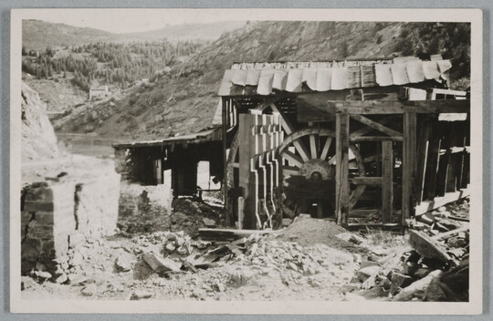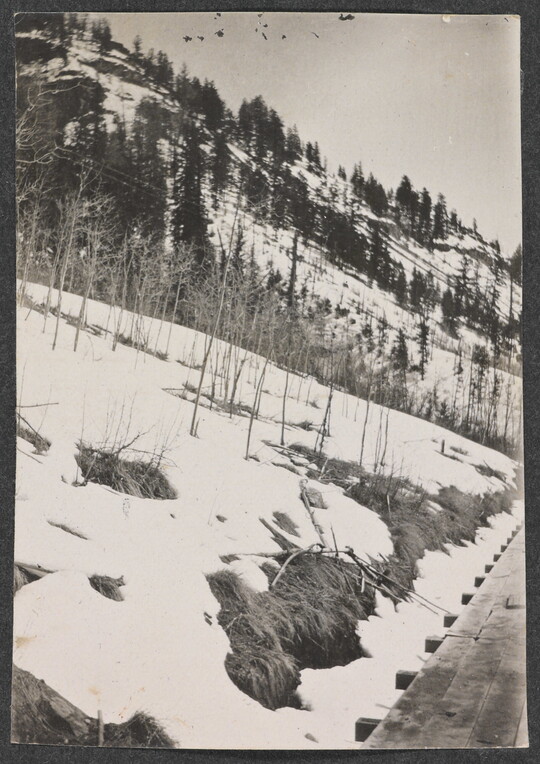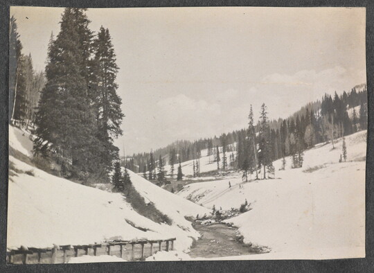 [Small waterfall with two people on riverbank], ca. 1900-1910