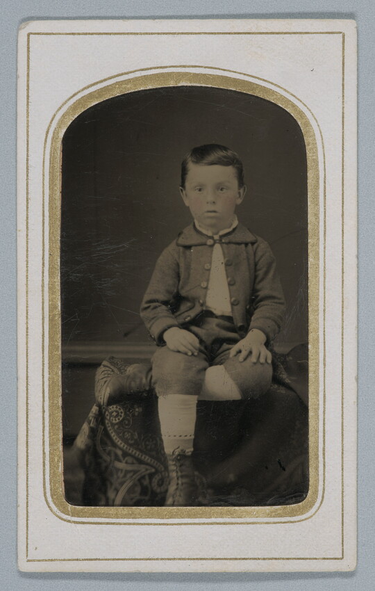 [Small boy seated with leg crossed underneath, full-length], ca. 1865-1870s