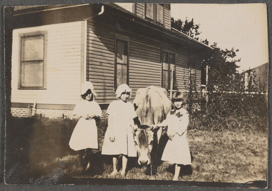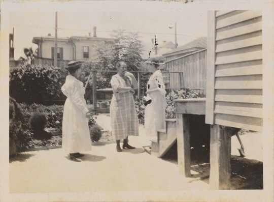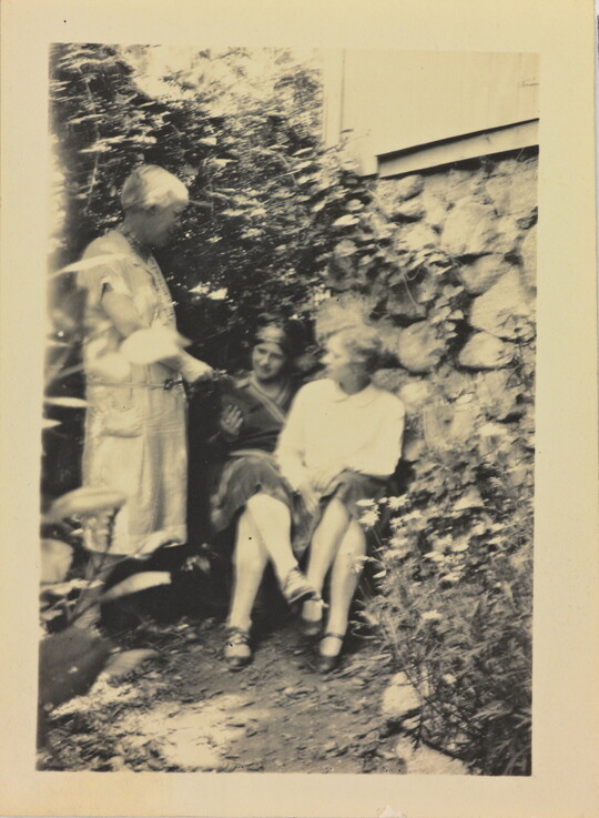 [Three woman and one man sitting on lawn], ca. 1910-1920