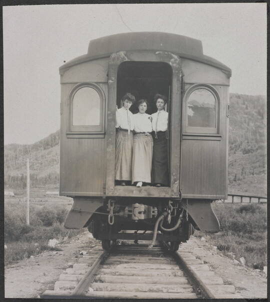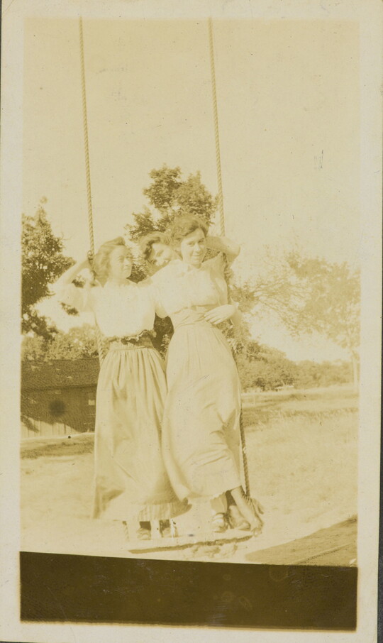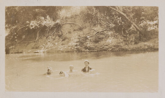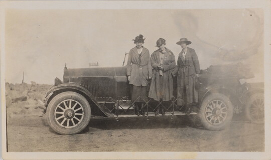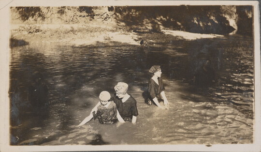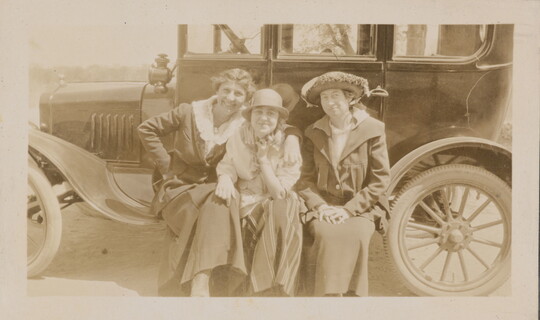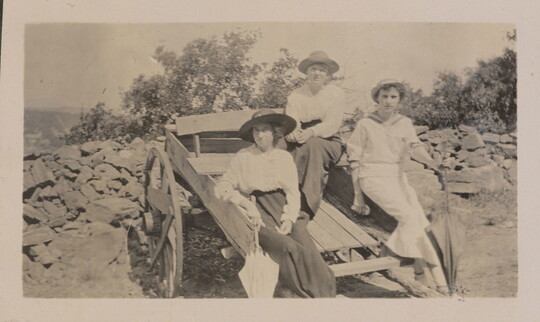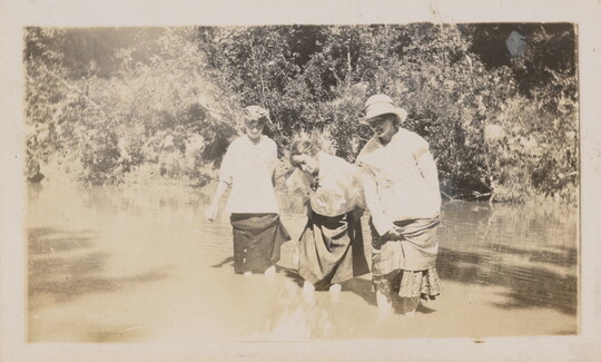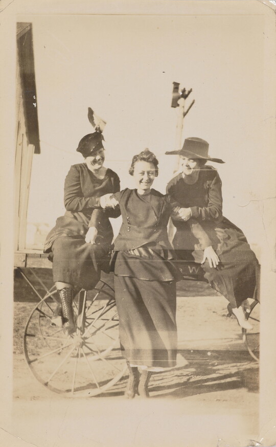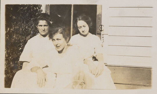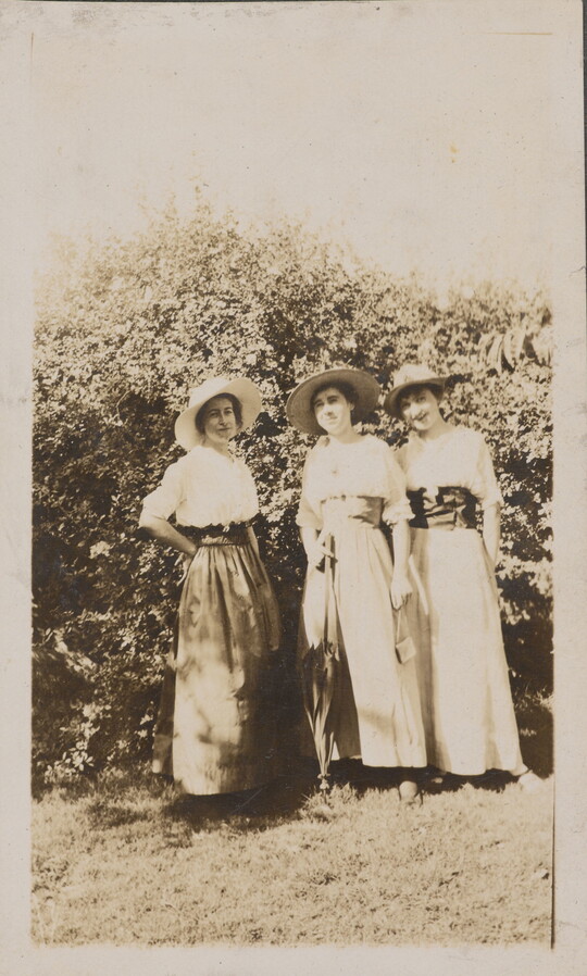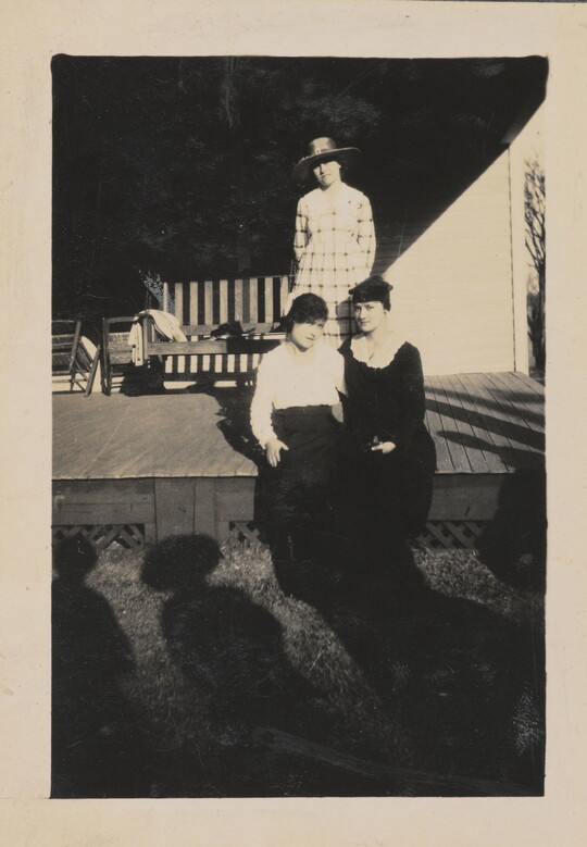 [Three women wearing hats and bonnets, sitting on riverbank], ca. 1910-1920