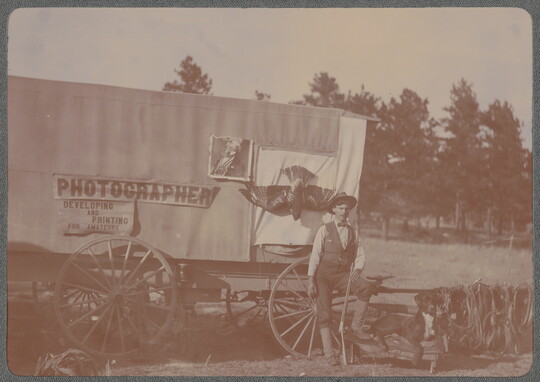 [Traveling photographer standing in front of wagon], ca. 1900
