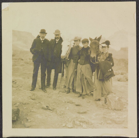 [Tourist party of three women and two men with two mules (at Grand Canyon?)], ca. 1900-1910
