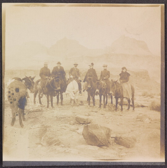 [Tourist party of six on mules, mountains in background], ca. 1900-1910