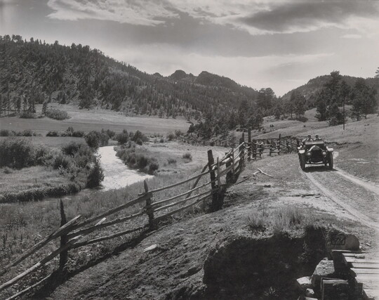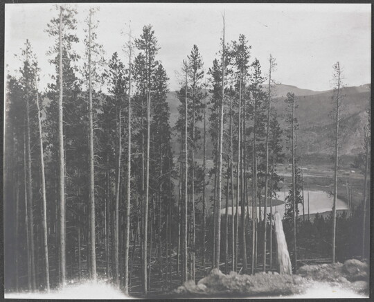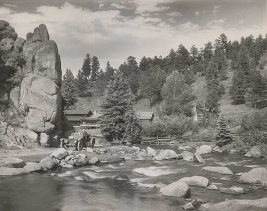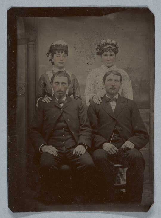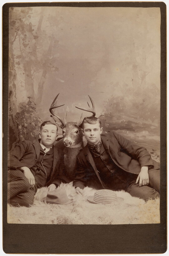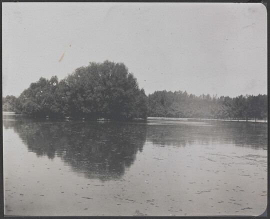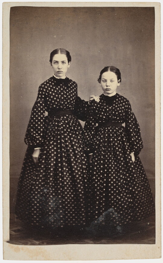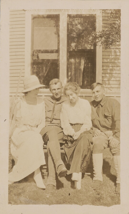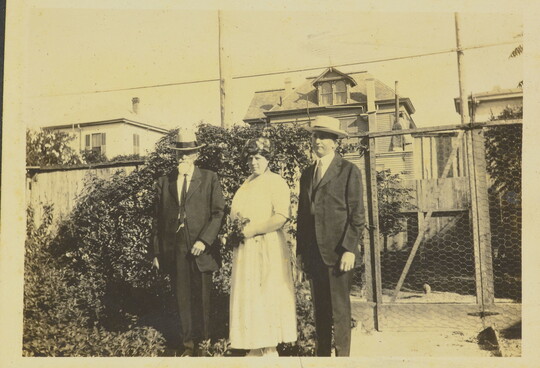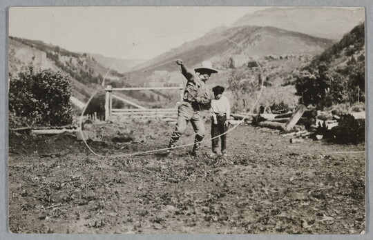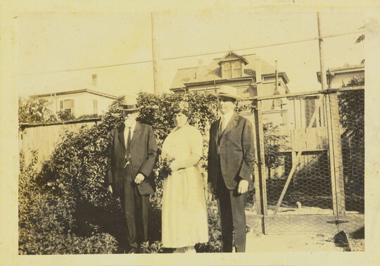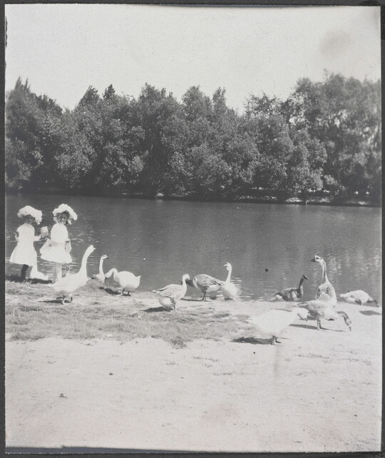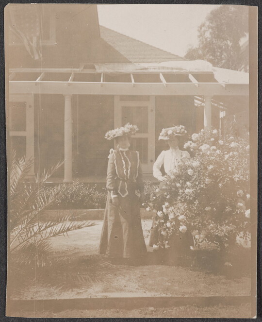 [Two ladies in flowered hats standing beside rose bush], ca. 1900-1910