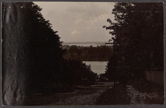 [View of bodies of water from tree-lined street on a hill], ca. 1900-1910