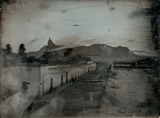[View in Durango, Mexico, with the Church of Santa Ana and the Cerro de Mercado in distance], ca. 1847