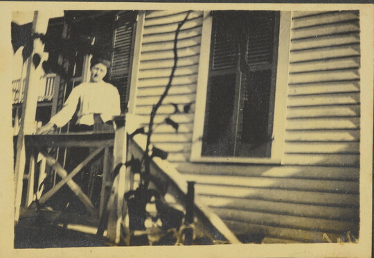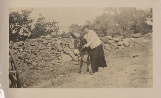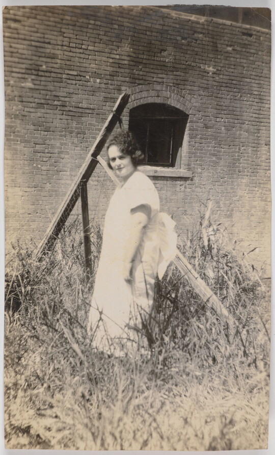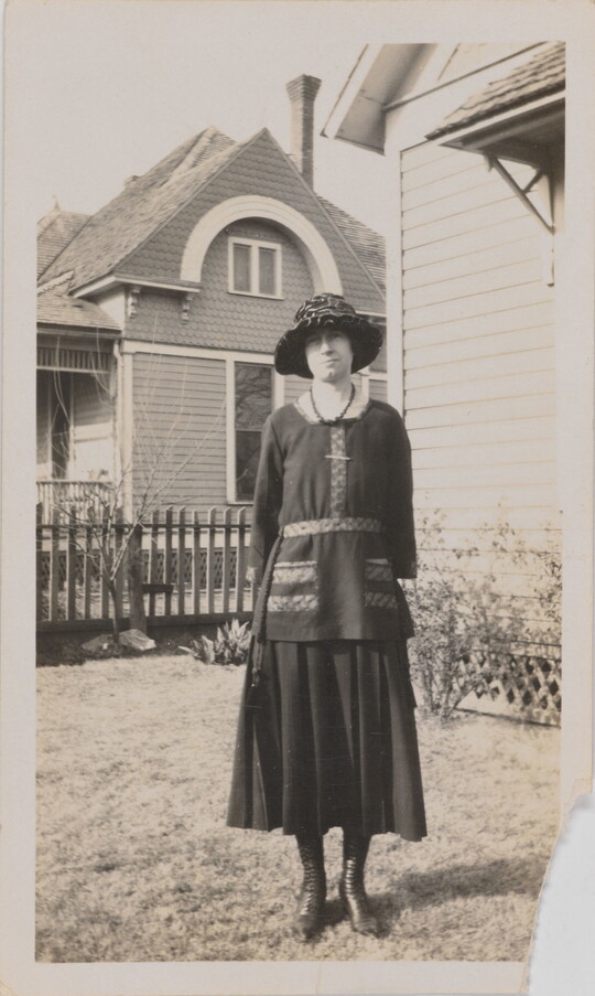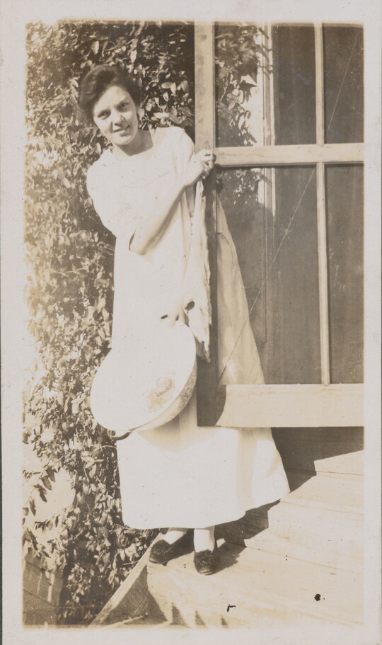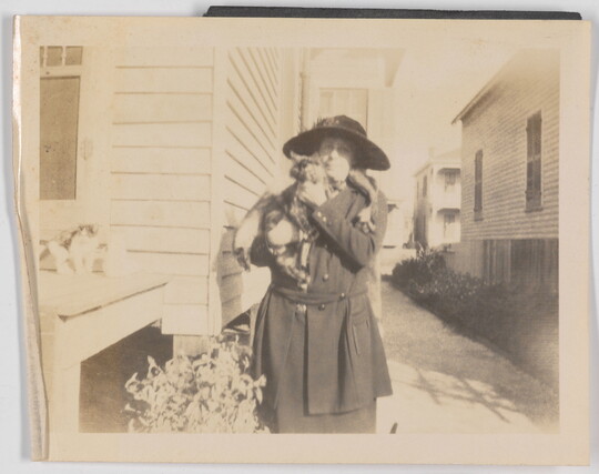 [Woman standing next to house, holding a cat], ca. 1910-1920