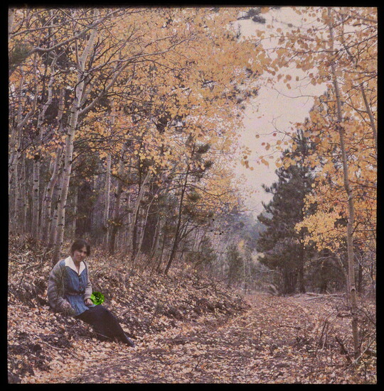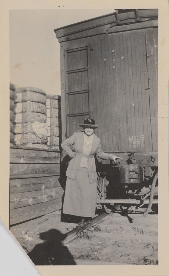 [Woman standing on track in front of railroad car], ca. 1910-1920