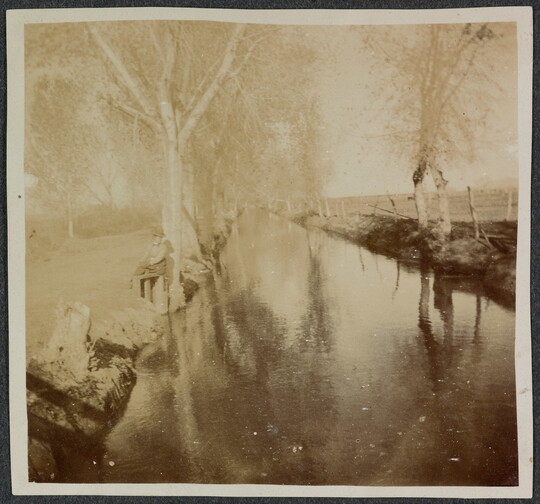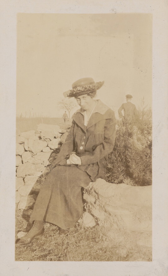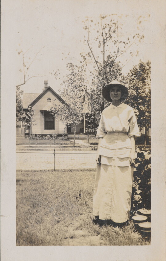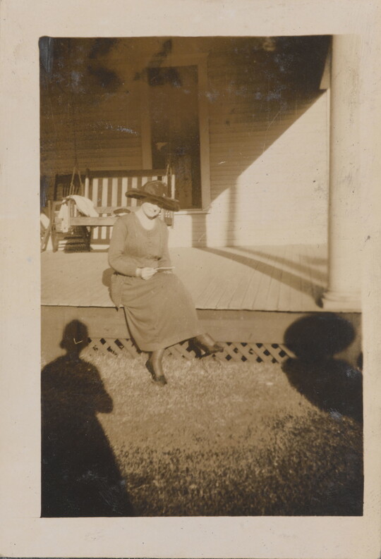 [Woman sitting in front yard, holding an infant], ca. 1910-1920