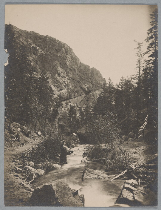 [Woman standing on railroad tracks next to train], ca. 1900-1910