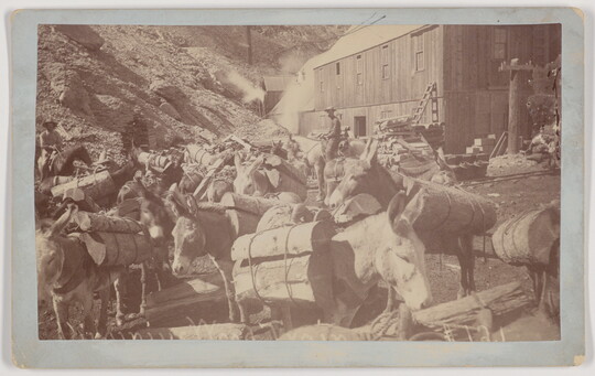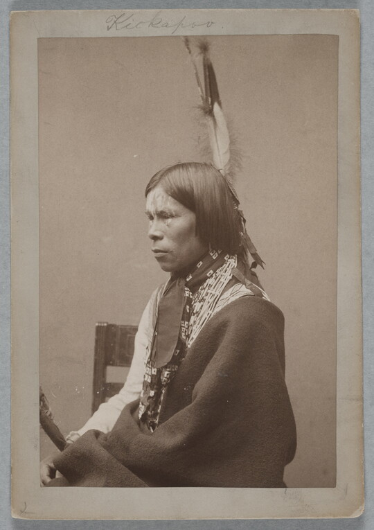 [Woman with feathered hat and badges on bodice, half-length], 1887-1890s