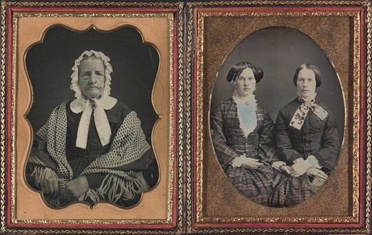 [Woman wearing lace bonnet and shawl and two women seated, holding hands], ca. 1840-1860