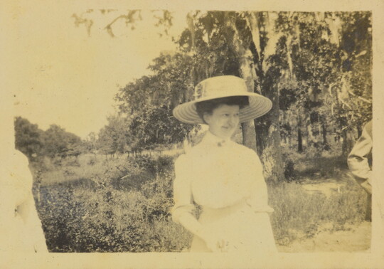 [Woman wearing a white dress and hat], ca. 1910-1920
