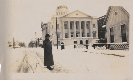 [Woman standing snow in front of First Christian Church of Fort Worth], ca. 1910-1920