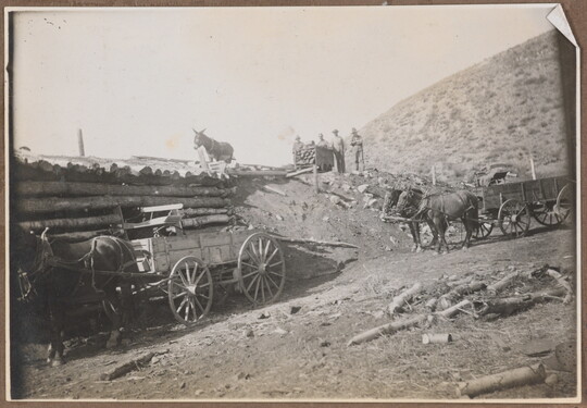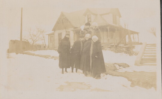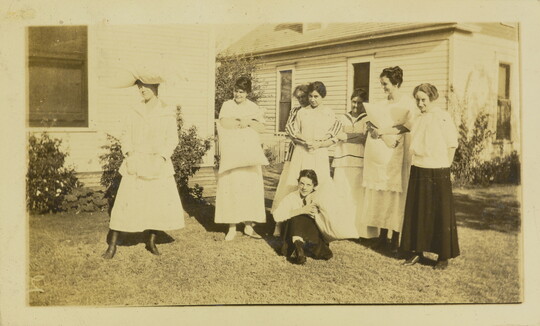 [Women standing in front of house, holding pillows], ca. 1910-1920