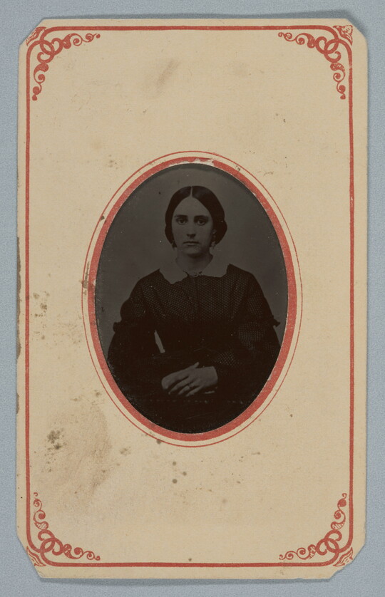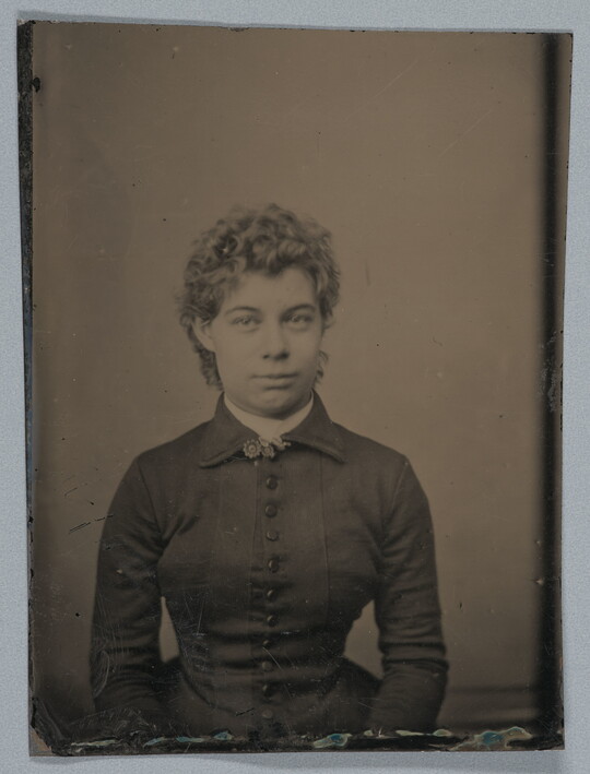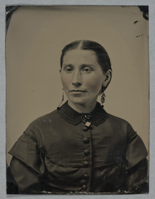 [Woman with pierced-earring, front-buttoned dress, bust-view], late 1860s-1870s