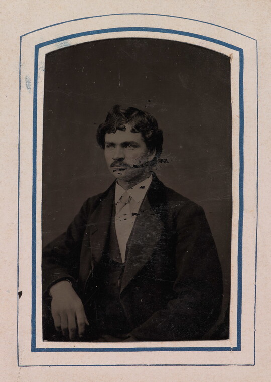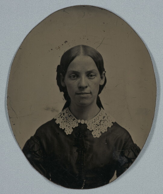 [Young woman in dark dress with lace collar, wearing cameo pendant], ca. 1850