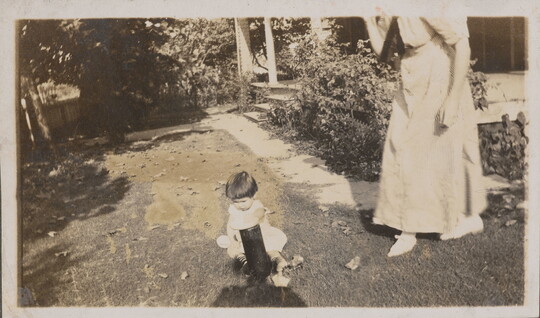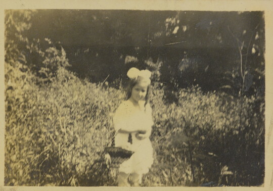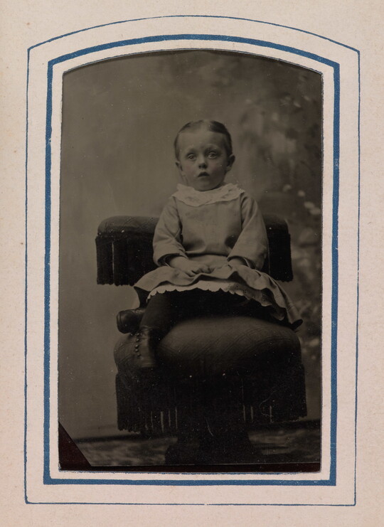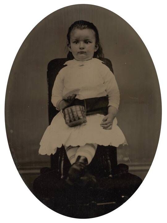 [Young girl holding woven basket, seated on stool that is perched on chair], 1850s