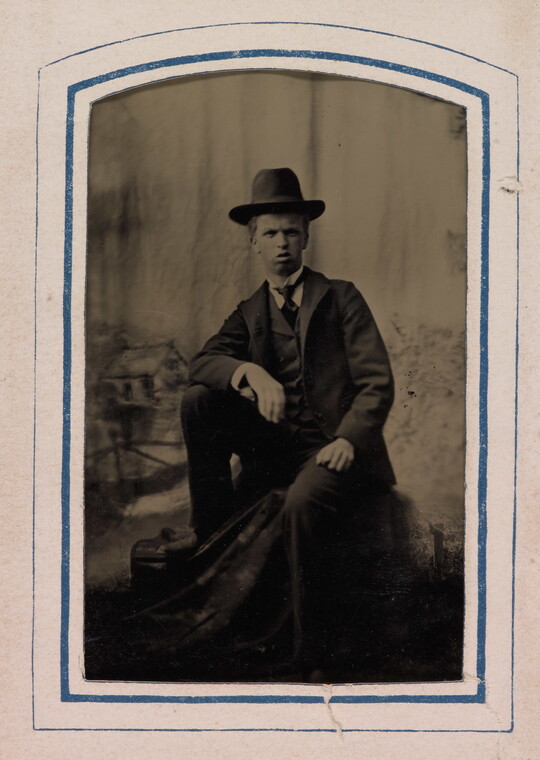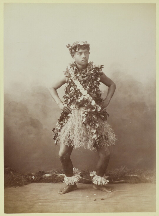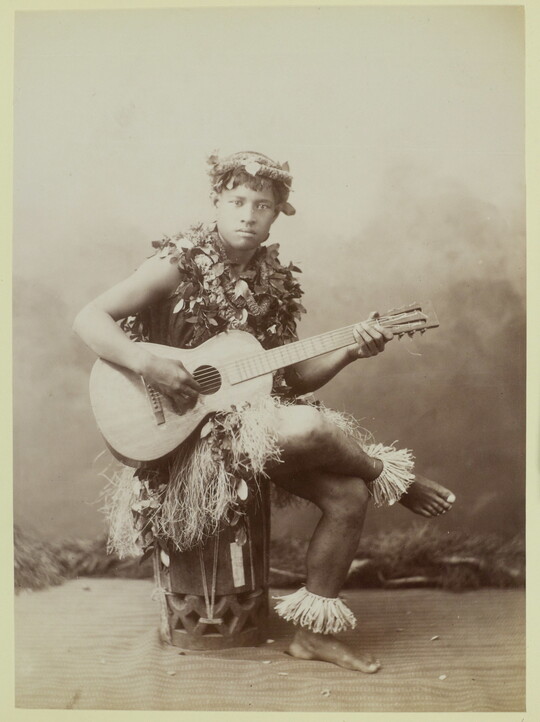 [Young man in grass skirt and leis strumming guitar], ca. 1890