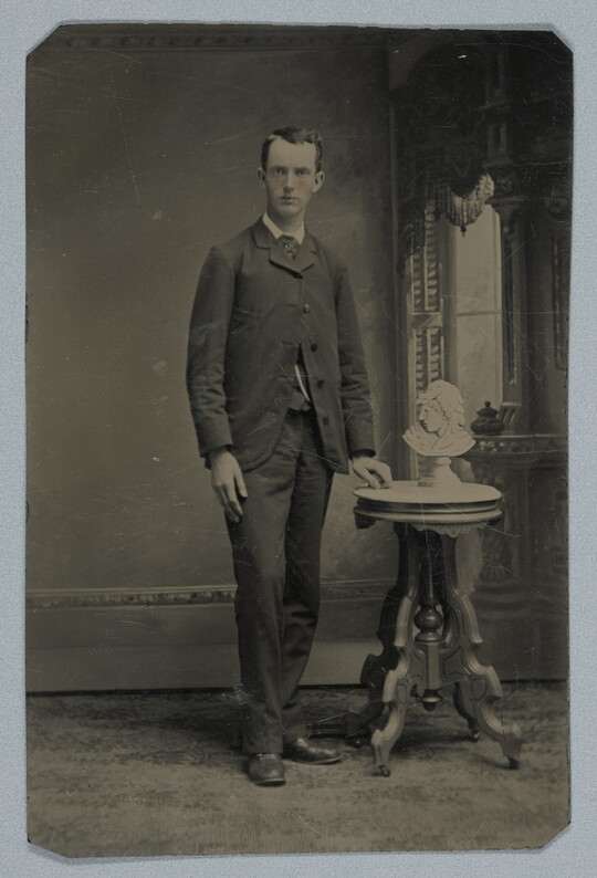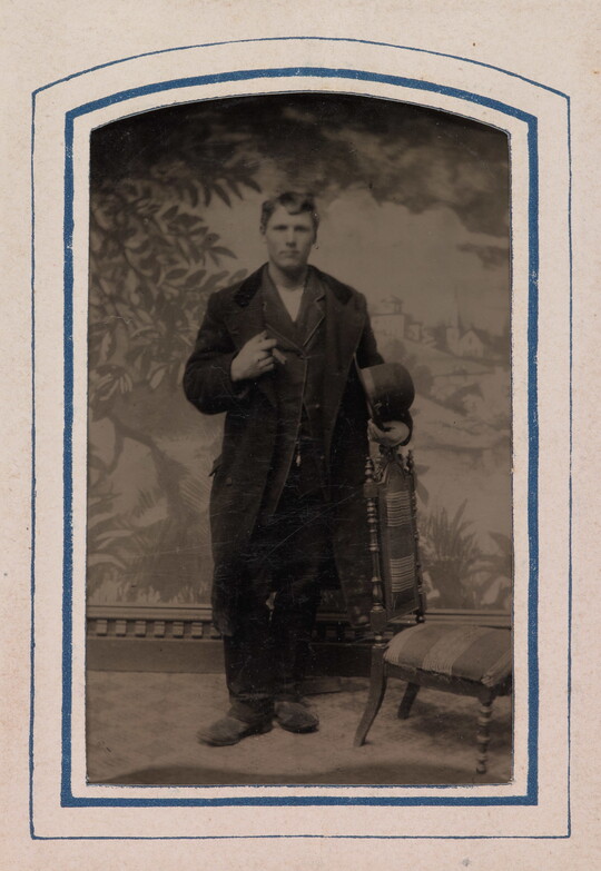 [Young girl standing, wearing hat and coat, full-length], ca. 1880-1910