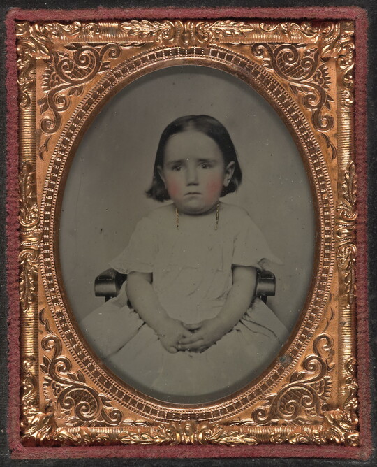 [Young girl wearing gold necklace, seated in chair], ca. 1850