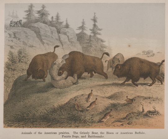 Animals of the American Prairies. The Grizzly Bear, the Bison or American Buffalo. Prairie Dogs, and Rattlesnake., ca. 1850-1900