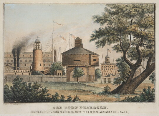Old Fort Dearborn, Erected at the Mouth of Chicago River for Defence [sic] Against the Indians., ca. 1857
