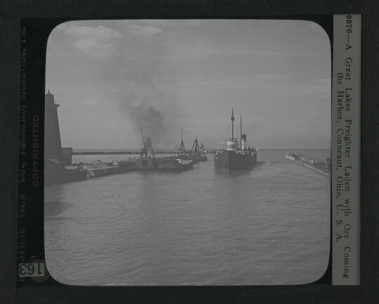 A Great Lakes Freighter Laden with Ore Coming in the Harbor, Conneaut, Ohio, U.S.A., ca. 1892-1930