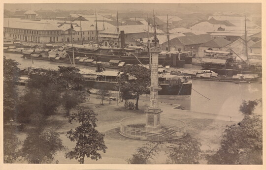 [View of harbor with memorial], ca. 1898-1902